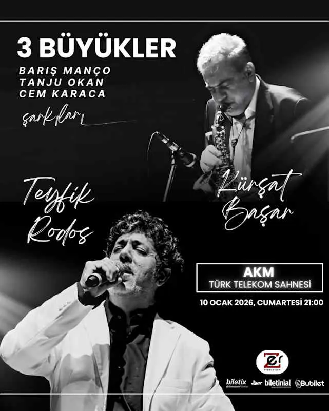 Türk müziğinin en önemli seslerinden üç büyük isim, müzisyen Barış Manço, Tanju Okan ve Cem Karaca, dillere pelesenk olmuş, zamana meydan okuyan şarkılarıyla “Üç Büyükler” konserinde İstanbul’da AKM de Teyfik Rodos’un yorumu ve Kürşat Başar’ın saksafonu ve anlatımı ile nostalji dolu bir geceye imza atıyor.