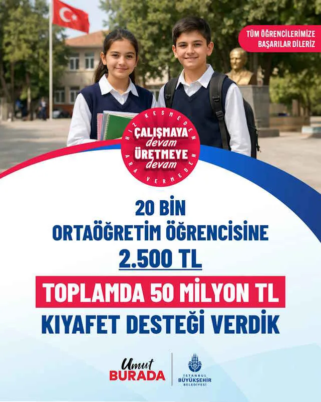İBB, eğitimde fırsat eşitliğini güçlendirmek amacıyla 2025-2026 eğitim-öğretim döneminde ihtiyaç sahibi 20 bin ortaöğretim öğrencisine toplam 50 milyon TL tutarında nakdi kıyafet desteği sağlıyor. Ödemeler 12 Mart itibarıyla tamam