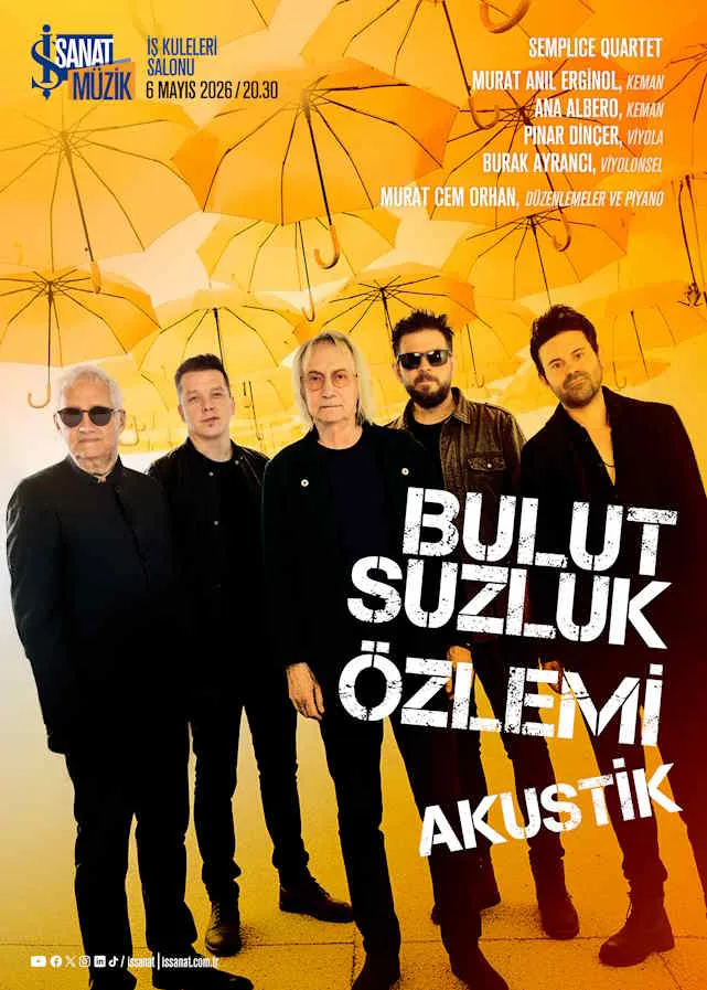 Türk rock müzik tarihinin en etkili ve uzun soluklu topluluklarından Bulutsuzluk Özlemi, 40. sanat yılını İş Sanat sahnesinde kutluyor. 80’lerden bu yana Anadolu rock türünde yakaladıkları güçlü sound ile geniş bir hayran kitlesi edinen topluluk, unutulmaz şarkılarının akustik düzenlemelerini, Semplice Quartet eşliğinde 6 Mayıs Çarşamba 20.30’da İş Kuleleri Salonu’nda yeniden yorumlayacak.