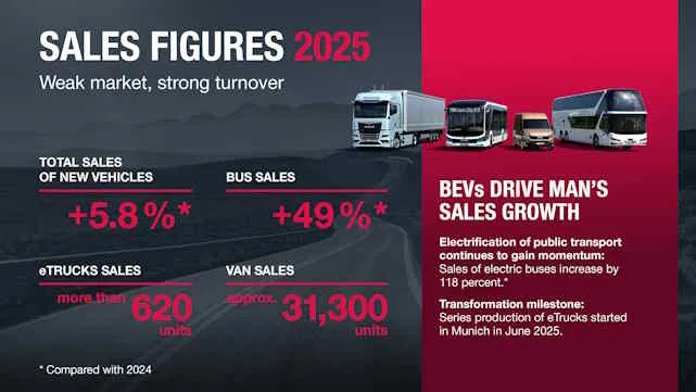 MAN'ın otobüs faaliyetleri 2025 yılında önemli bir toparlanma göstererek, yaklaşık %49’luk artışla 7.000 adedi aştı. Bataryalı şehir içi otobüsler, bu segmentteki satışları artıran en önemli faktör oldu. Şehir içi elektrikli otobüs satışları %118'in üzerinde artışla 1.300 adedin üzerine çıkarak yeni bir rekor kırdı. Bu rakam, 2026’nın sonunda Avrupa pazarındaki ilk müşterilere teslim edilmesi planlanan MAN Lion's Coach E’yi kapsamıyor.