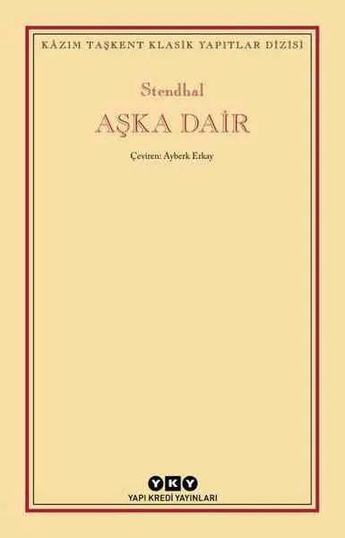 STENDHAL’dan AŞKA DAİR- Kazım Taşkent Klasik Yapıtlar Dizisi. Klasik dünya edebiyatına Fransızca iki roman başyapıtı (Kırmızı ve Siyah, 1830 ve Parma Manastırı, 1839) armağan eden Stendhal’in İtalyan özgürlükçü Metilde Viscontini Dembowski’ye beslediği karşılıksız aşkın ürünü bir eser. Belki de “Aşk”ın psikolojik ve sosyolojik tahlillerinin düşünce tarihindeki en saf anlatısı. Yazarın meşhur “kristalleşme” kavramını içeren kitap, dönemin romantik ruhunu fazlasıyla aşarak, 19. yüzyıl Avrupa toplumunda aşk olgusu ile kadının toplumsal konumunu ve farklı coğrafyalardaki değişimini kendine özgü üslubuyla kaleme alıyor. 264 SAYFA. (YAPI KREDİ YAYINLARI)